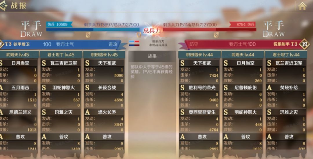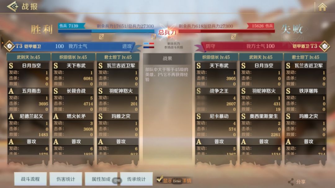 可以看出,同兵种、同等级且红度接近的情况下,长筱织田的强度并不弱于战王织田,甚至还可以低战损取得胜利,由此可见阵容的强度。