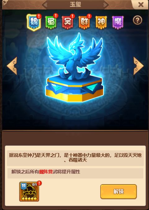 各位主公大家好呀,今天由我来给大家介绍游戏的玉玺系统。各位主公征战达到230关时将开启玉玺系统,游戏中共有六种不同的玉玺,分别对应魏蜀吴群神魔六大势力,不同的玉玺将为不同的势力带来专属属性提升。