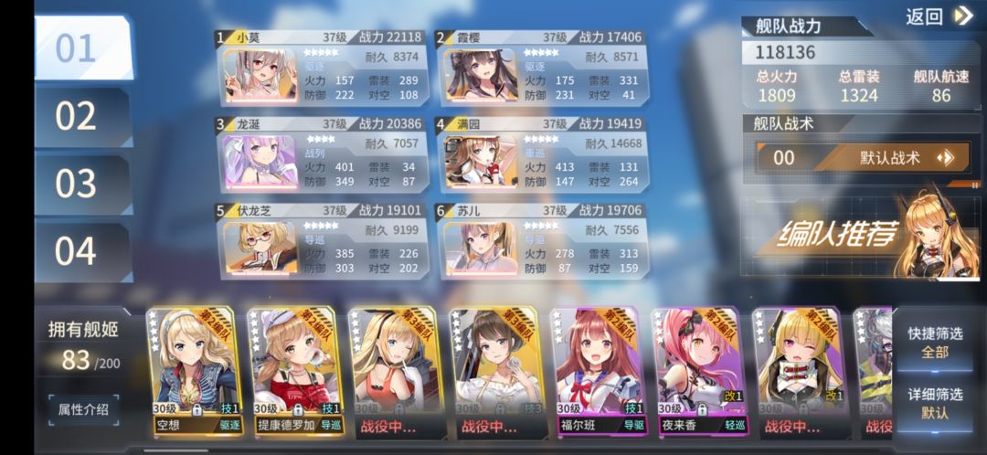 目前20图毕业,12万战力,只买了月卡。二区演习刚刚打到30。前期是雷击队,后期转炮击。龙崽必带 节省能量。总结一下这个阵容,这个阵容太脆了,培养难度高,新人不建议练。但个人认为后期有一战之力,因为火力和雷击都很可观,比战列航母都要灵活。比较鸡肋的是小莫的技能,晚上很猛,比新战列还猛。但是一般都拖不到夜战,而且打航母队很困难。养小莫的主要原因是因为她比较可爱,这就足够了。