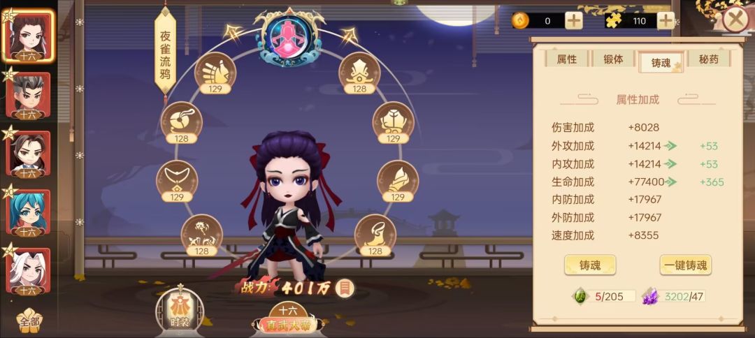 铸魂—优先龙儿跟上当前等级,卡鎏金石时掌门小鱼可倾斜一些,方便推塔。
