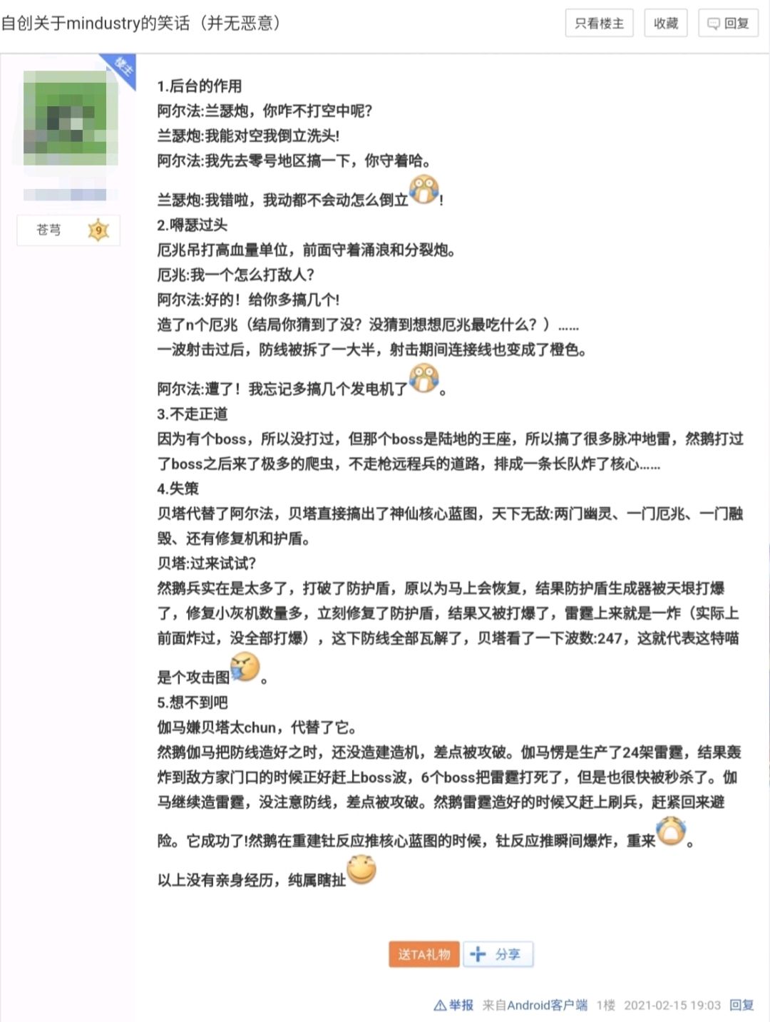 总的来说,后台的防守波次只与每秒总伤害、建筑总生命值、总修复效率相关,这几项有一项短板,都会导致可防守波次大大降低。防守炮台强烈建议选择硫化物火焰,在没有任何加成的情况下单个炮台就可以达到60×10=600 dps。力墙投影会同时增加建筑生命值与修复效率。另外实践表明,超速可以提高防守波次。兵种对于防守波次的作用有待补充。关于防守波次的计算细节这里就不展开了,详细规则可以看下面帖子: