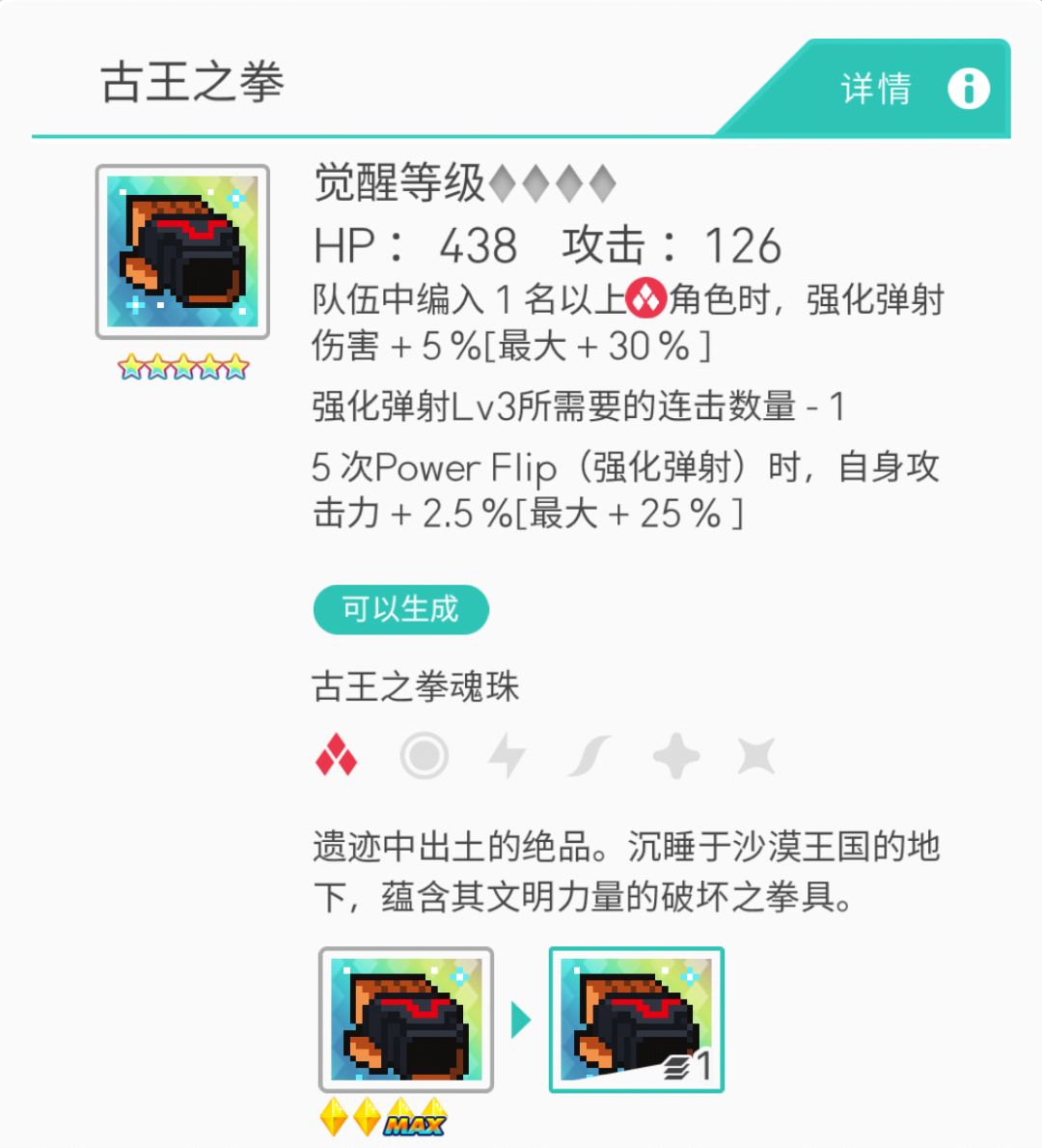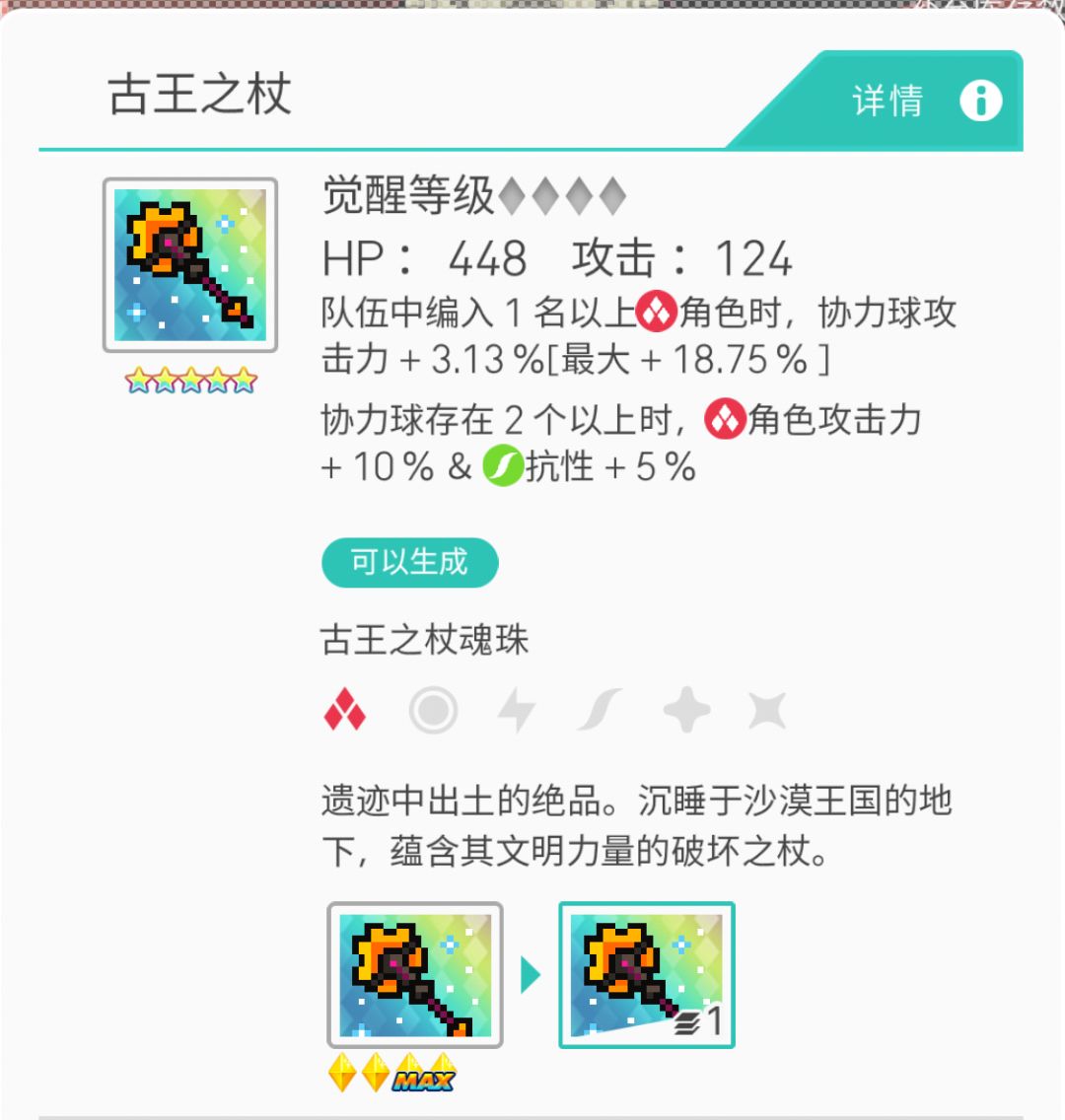 观察到没,两个效果都是协力球加成。有的小伙伴可能会问,协力球是什么东西?协力球就是面包队的核心,通过角色放技能不断的召唤协力球进行攻击。所以很明显,古王杖是面包火的专属武器。