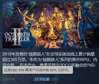 史克威尔艾尼克斯旗下的角色扮演游戏《歧路旅人》系列已经推出了全新的续作——《歧路旅人2》,游戏于2023年2月24日正式登陆Switch、PS5、PS4、Steam平台,截至目前的好评率为96%,可以说是口碑相当优秀了。
