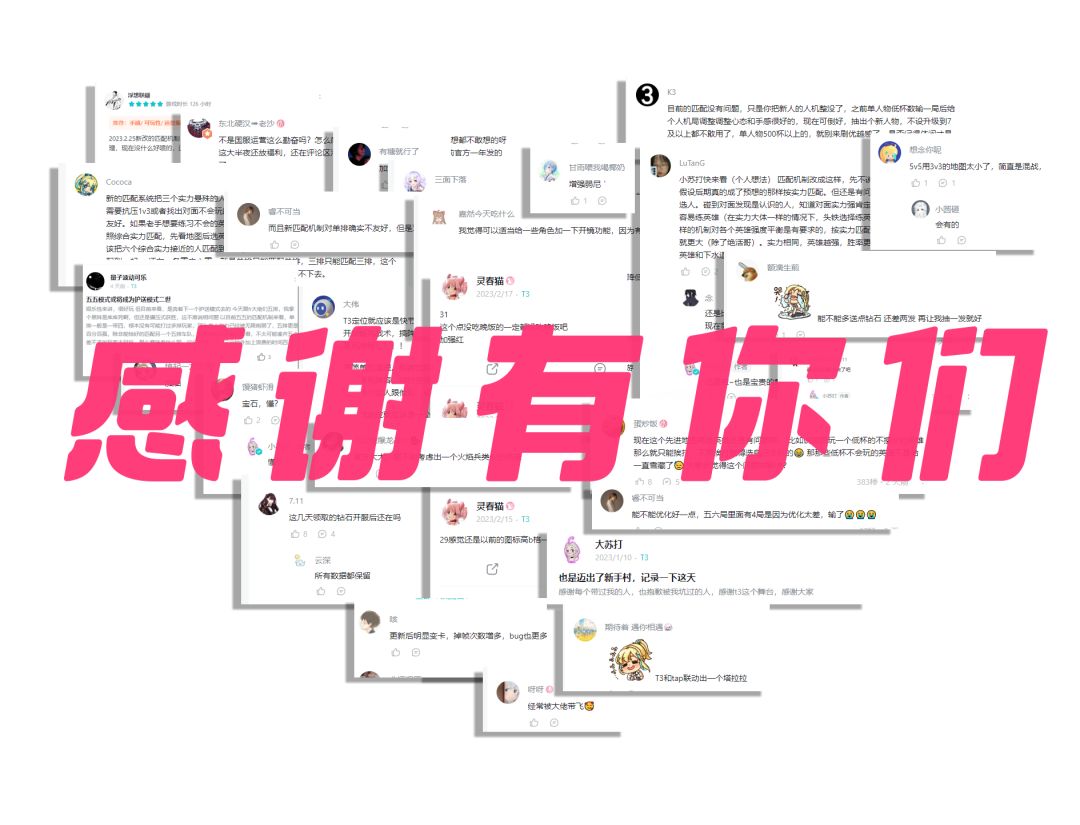 从篝火测试开启,到开启赛季日益稳定,再到如今篝火测试正式结束,T3走到今日离不开选手们的支持,感谢奶思,万物,花花,锁匠四位玩家管理为T3的付出和努力,走到如今这一步四位功不可没,大家辛苦啦!以及全服首位万杯大佬,怪·点·T3肝王·马马马,老玩家们熟知的集锦常客·音浪毁灭者·只要排到一切都会有·小走狗,大家都熟悉的整活King·T3段子手·多才多艺·藤木电竞椅持有者·东北硬汉老沙,还有许许多多因篇幅来不及提及的,奋战在竞技场的选手们,T3感谢有你们!