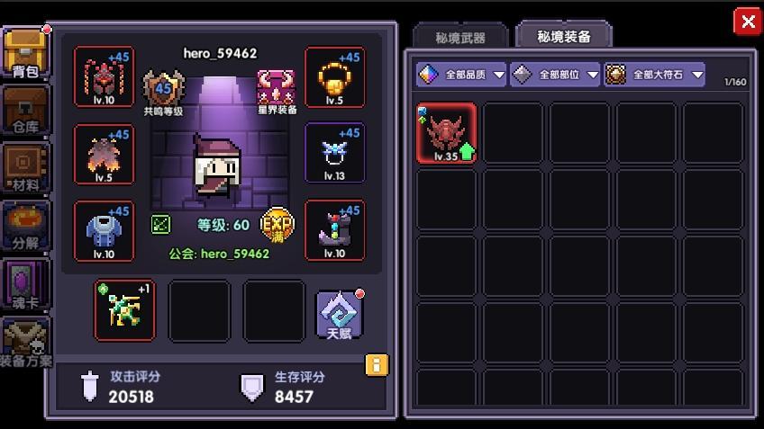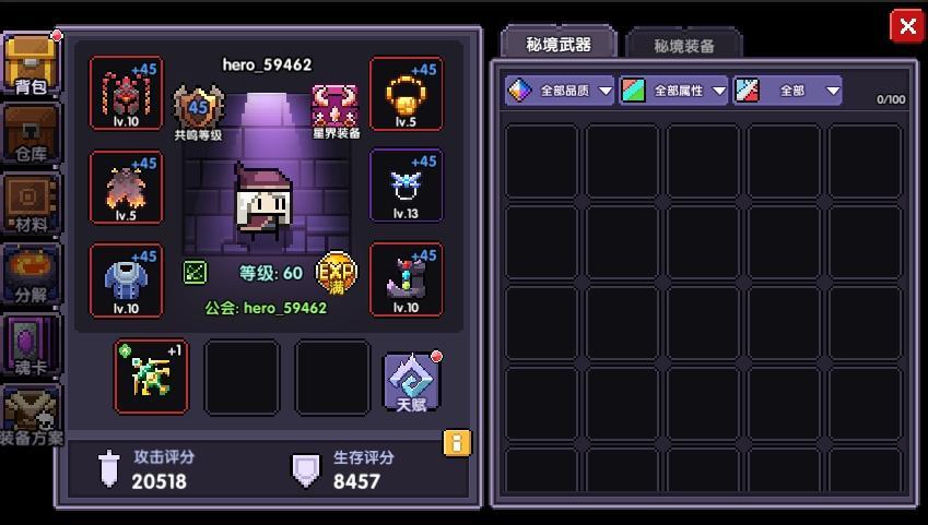 1、新增秘境武器背包栏(100格子),武器和装备2个背包的容量互相独立。