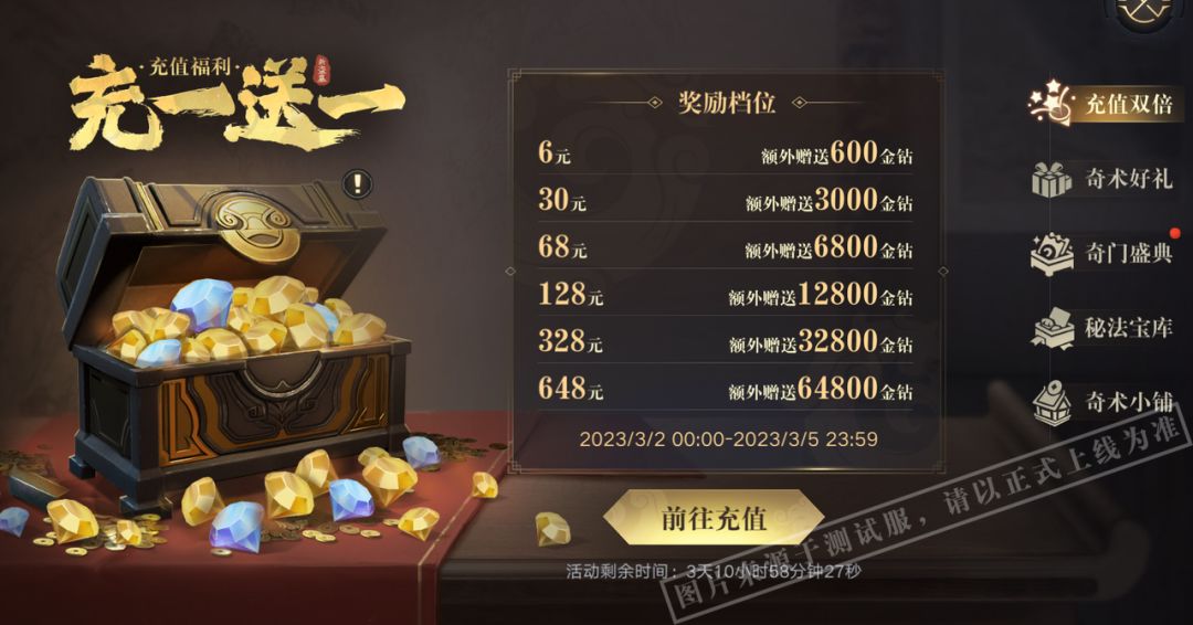 活动期间限时开启充值赠送额外金钻。