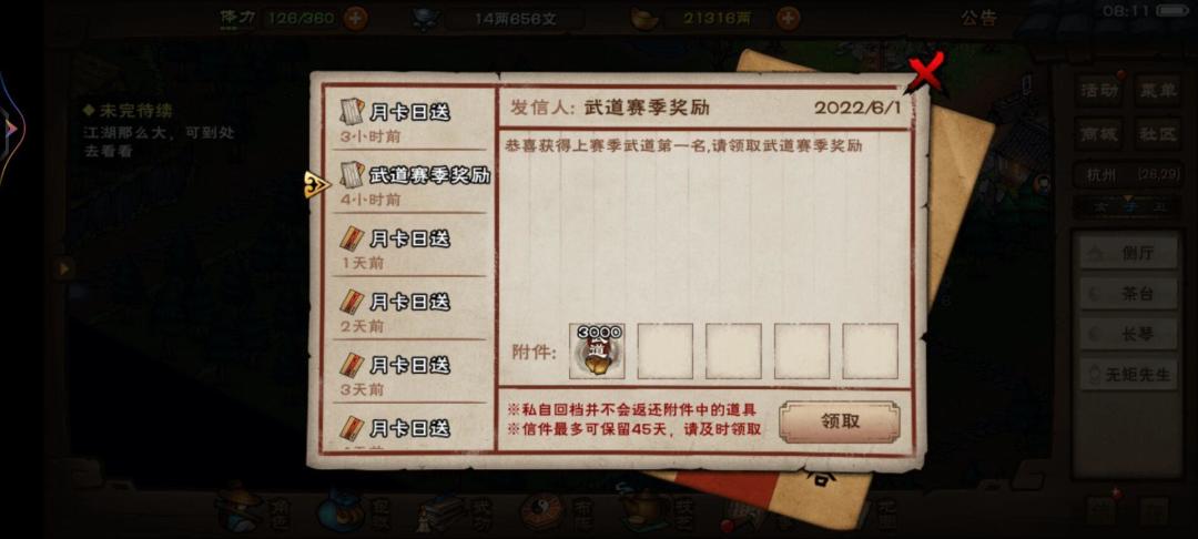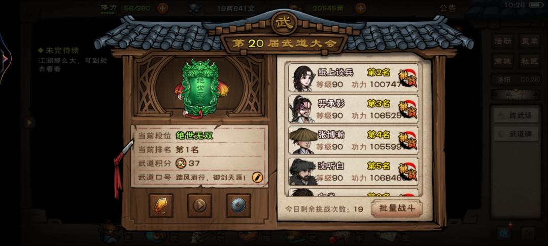1:20-40级我们可以去把庖丁解牛拿了,每天运镖够一定次数解锁巨鲸帮,去双王买一个琴和三个琴谱弹琴,雁行功九重了去把文皇经拿了