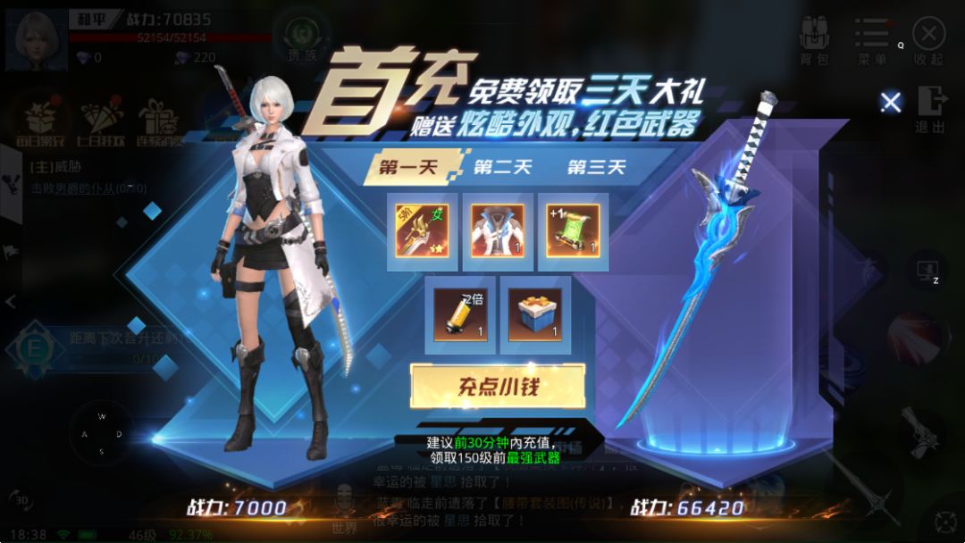 首充大礼包分为三天,每天的内容完全不同,第一天的内容是两件装备和三件消耗品,武器方面是150级前的最强装备:5阶的帝国秘银配刀,不仅伤害非常高,还可以随即生成属性,非常的使用,同时还可以获取一件有属性加成的时装,好看又实用,再加上大量的经验辅助物品,可以让你获得超快的升级速度。