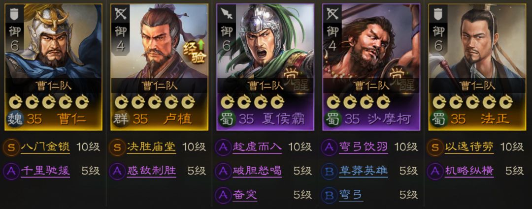 输出核心:核心输出位夏侯霸,沙摩柯二号输出位,卢植三号输出位,法正四号输出位。