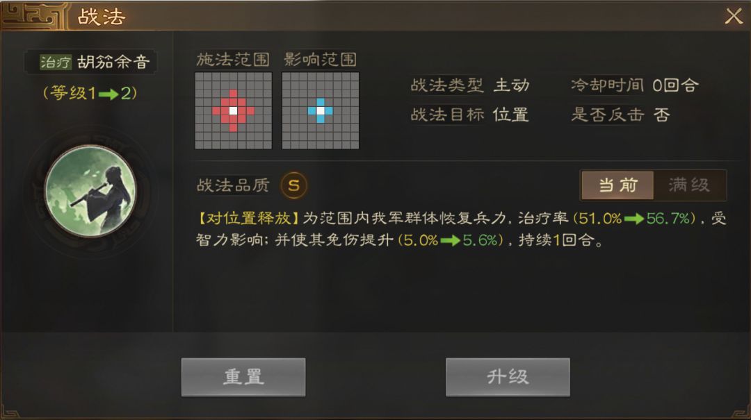 蔡琰是个非常实用的治疗位武将,群体治疗、增加免伤,关键他的战法【胡笳余音】冷却时间0回合,即每一回合都可以释放,所以她不再适合带其他主动战法,适合被动或启动战法。因此,推荐度最高的是被动类战法,在预抽卡池中,李典的传承战法【长者之风】给大范围队友加属性,非常契合。