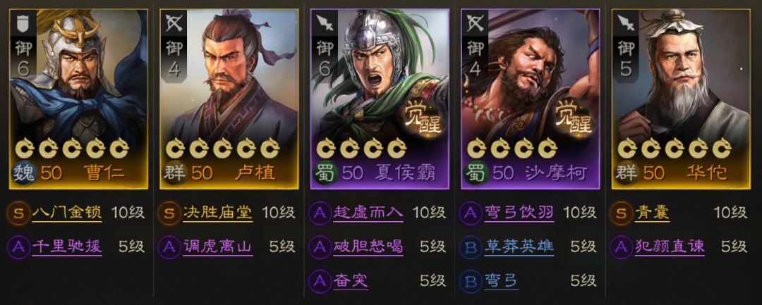 核心打法:减防加伤后集火秒人!沙摩柯普攻减防减智,卢植【决胜庙堂】提高伤害,夏侯霸【趁虚而入】超高爆发接手,很难有开荒期敌人在这三板斧下可以顺利逃生。曹仁在这个阵容中的定位是:保障我们的攻击单位前两回合安全,一个抵御+一个援护保护力度十足。华佗不断给曹仁治疗恢复,让他可以坚持到第二轮【八门金锁】+【千里驰援】即可。