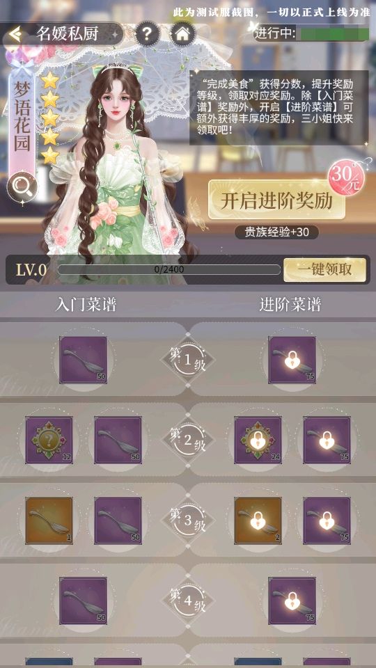 分数可升级【私厨菜谱】等级并领取其他道具奖励,开启进阶奖励可获得大量【金珍勺】和【银珍勺】。