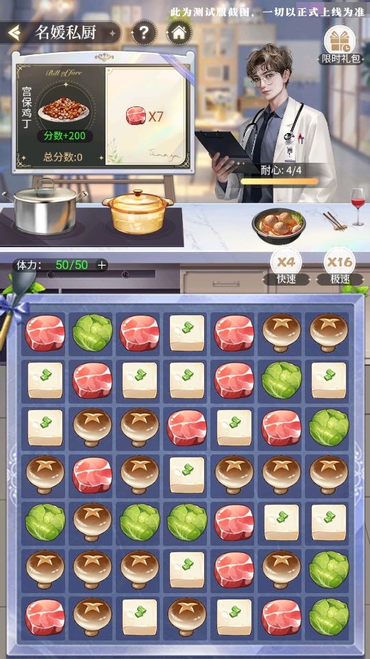 体力消耗:活动期间内可消耗【体力】来参与名媛私厨活动,棋盘内有豆腐、蘑菇、蔬菜和肉类四种食材,选择其中一个食材向八个方向连线,连中三个或以上的相同食材即可将其消除并获得分数。