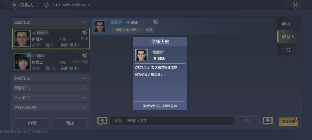 Tips:【结缘祝福】奖励有次数限制,最多可在一周内领取4次祝福奖励,和同一人进行【结缘祝福】获得奖励后有24小时冷却时间,无法再次获得该对象的祝福礼物,不过可以与其他结缘人互送【结缘祝福】。(结缘祝福剩余次数可在联系人界面上方查看)