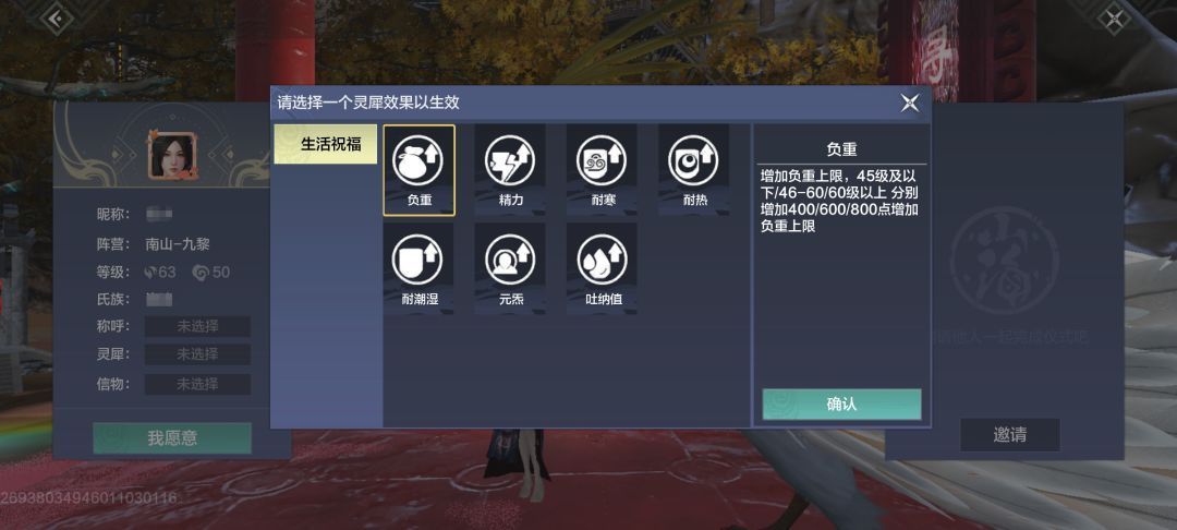 与人结缘可为自己添加灵犀效果,每次结缘时旅者都可以选择一种生活祝福获得,提高负重、精力、耐寒、耐热、耐潮湿、元炁、吐纳值上限,关系存续期间效果始终生效。