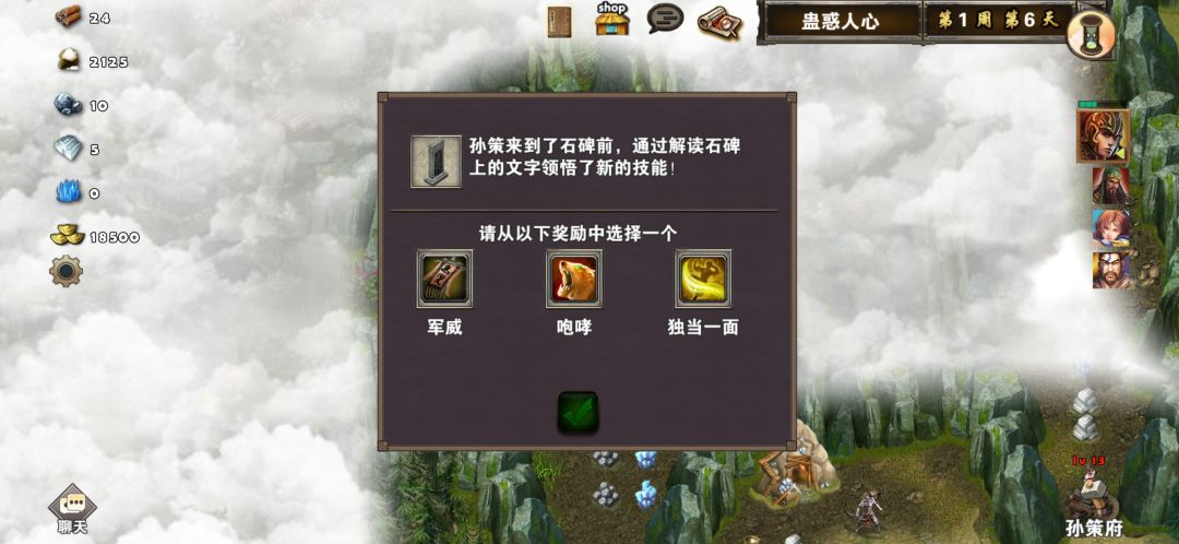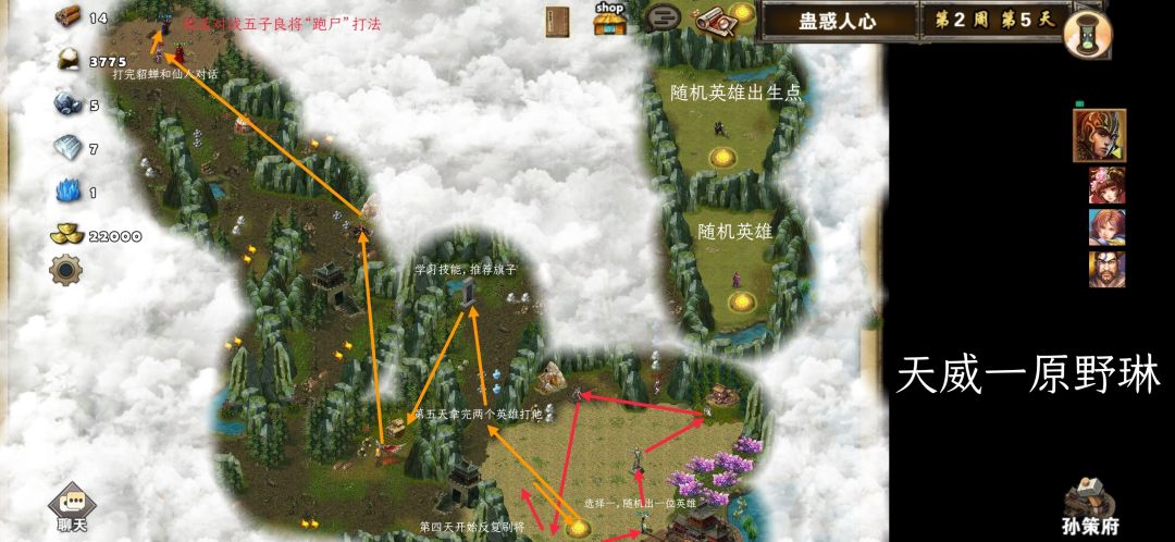 后是主力。尽量刷出优越武将。拿到2个副将后,出来往左走。路上当你干掉第五个敌将时候,开局给你的那个副将就会被换掉。后面的敌人兵力都比较猛,打不过可以采取跑尸的打法,时间限制是35天也就是5周。如果复活出来就可以顺便把不动的2个敌将干掉,可以学技能。