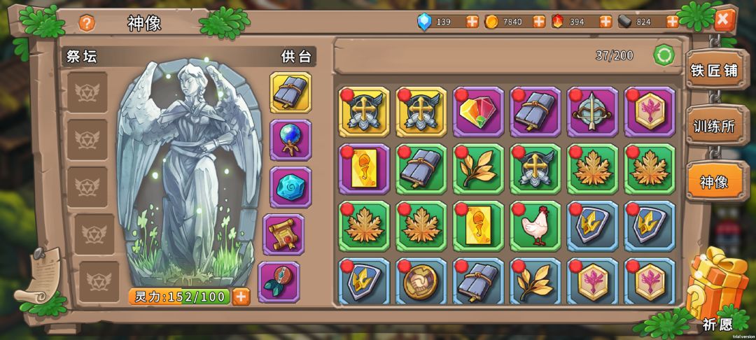 神像,圣物抽卡只抽到第一次出神器,供台我的配置如图从来没换过我觉得这是最重要的且必带的。人数,选卡,灵魂(避免意外有人死亡),通关选一人和一卡(永远把盾卫和一夫当关拿上)这个保证你任何开局好打,不会翻车。(祭台其余有啥放啥,看个人,其余的随便用,不管什么品质,留着没用,过远征推荐拿加小兵伤害,初始粮食,boss减伤,会员卡)