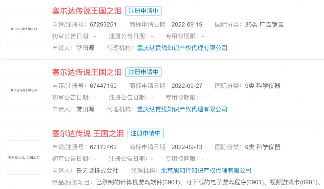 抢注人为自然人“常某某”,已经同时抢注多个“塞尔达传说王国之泪”“王国之泪”商标,其中一部分商标注册已经被驳回,“王国之泪”的商标正在初步审定公告中,异议期限自2023年2月28日至2023年5月27日止。