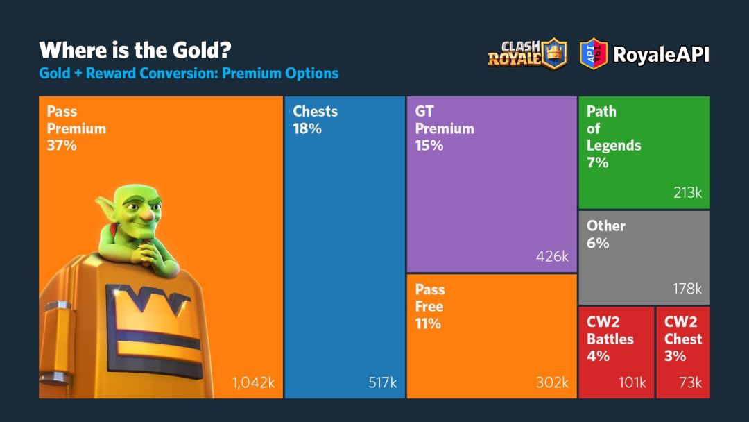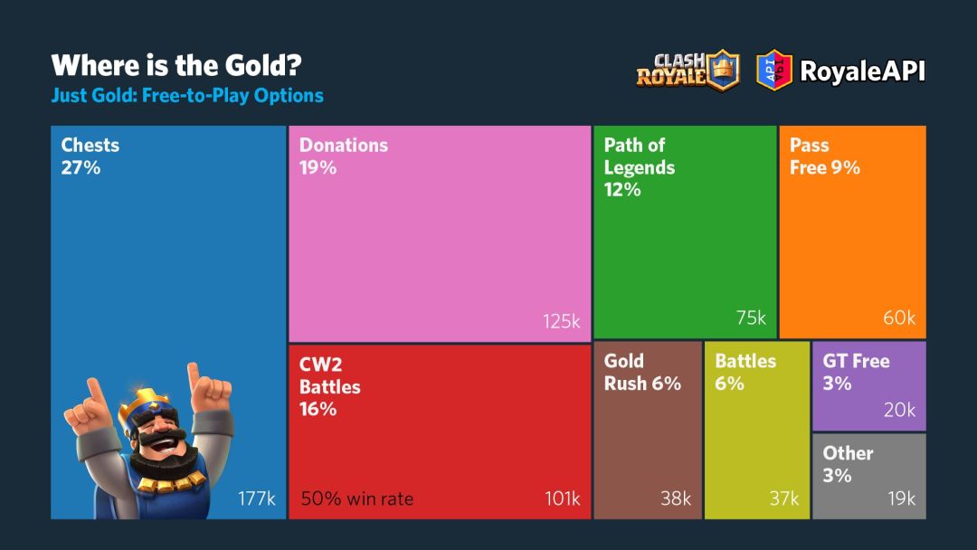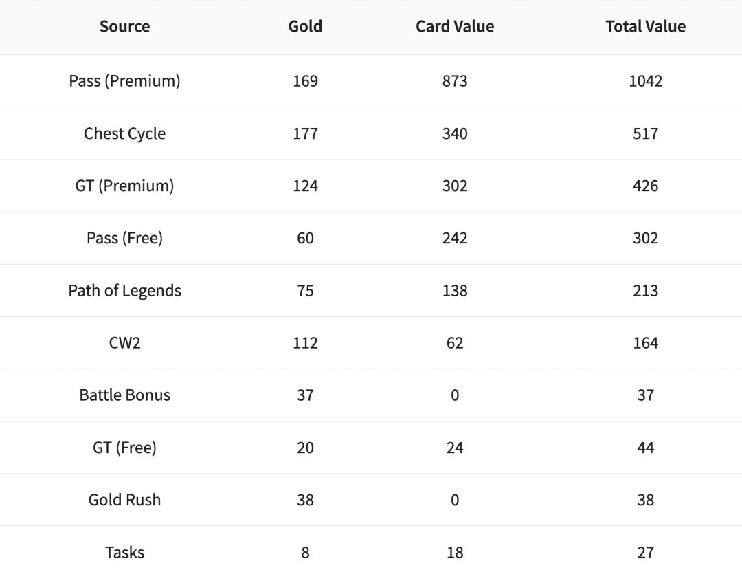 假如关注赛季获取的全部资源,皇室令牌就成为了主要来源。宝箱周期和全球锦标赛奖励紧随其后;部落战2退到倒数的位置,因为它基本不给什么卡,大部分都是金币。