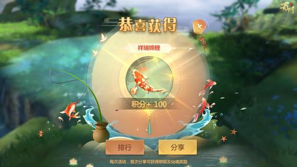 活动期间,每钓起一条鱼都可以获得经验、灵力和钓鱼积分,钓鱼积分达到200即可领取参与奖励,而积分排名在前列的玩家可以获得永久自选时装包和限时金色称号。 门叔小提示,每隔一段时间将会在钓鱼点随机刷新鱼王【祥瑞锦鲤】,钓到鱼王的选手可以获得大量的积分,这也是取胜的关键!