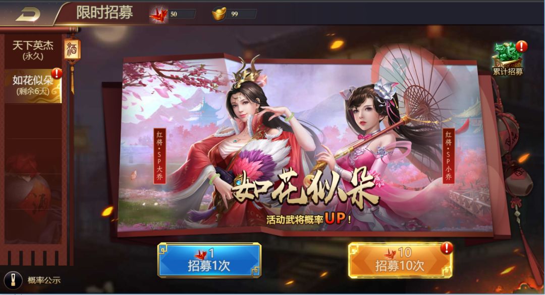 6.限时招募:“如花似朵”来袭,SP小乔、SP大乔概率UP;累计招募SP小乔将魂、SP大乔将魂领不停!