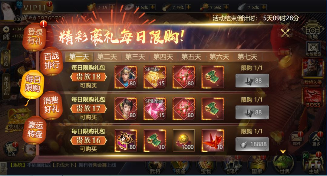 3.每日限购:千纸鹤、海量极品道具加入,180武将-SP马超、SP张星彩降临!