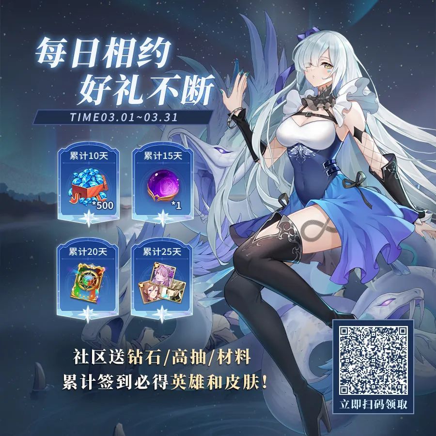 日日有礼包,天天赠福利!每日前往社区->点击每日福利,签到即可领取对应游戏道具。周日更有惊喜盲盒派送,最高可开1000钻石、10连抽、25五星碎片等珍稀道具哦!