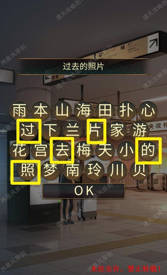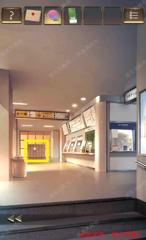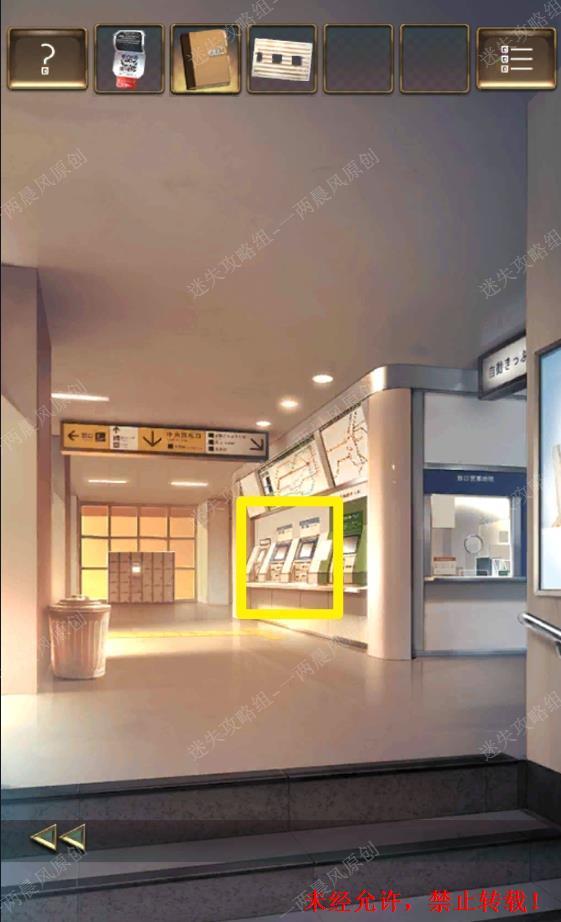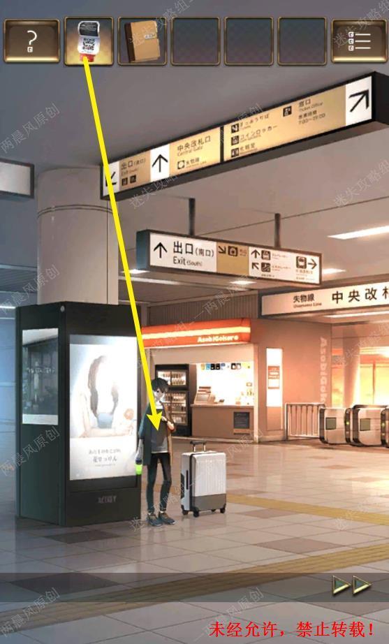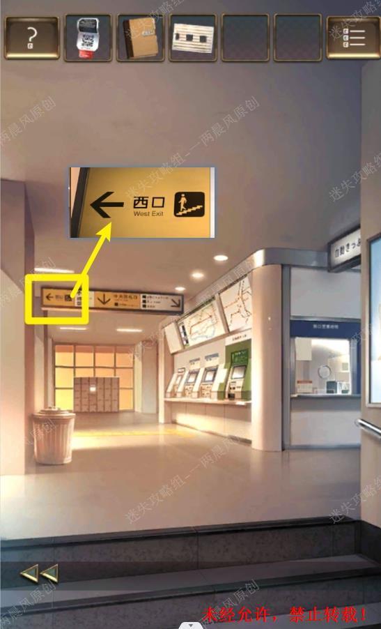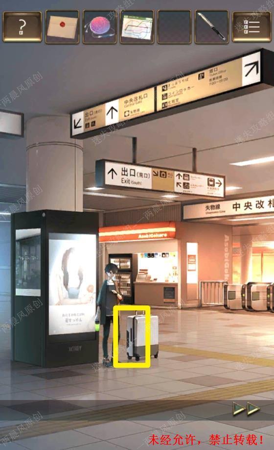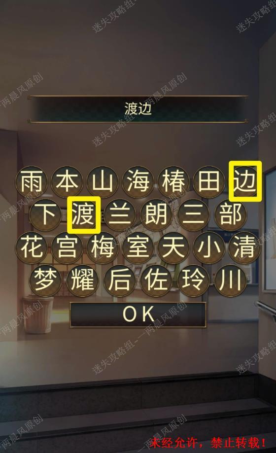 23.观察发现初始场景中央顶部的中央检票口的方向图案以及右侧场景中西口的方向图案与在行李箱中观察的图案一致。再结合密码本的解锁图案,“右左右左右”即是“中央检票口-西口-中央检票口-西口-中央检票口”,顺序点击密码本上的图案即可解锁。打开密码本后得到手机男孩主人的线索,主人名叫渡边。23 23.1