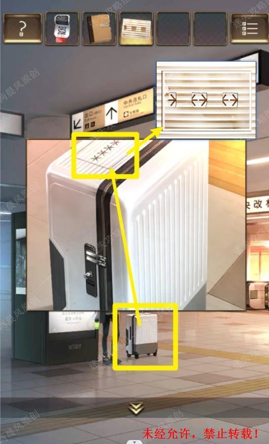 22.将【开洞的照片】放置在男孩身边行李箱顶部的图案上,可以得到一个有指向方向的图案,方向是“右左右左右”。22