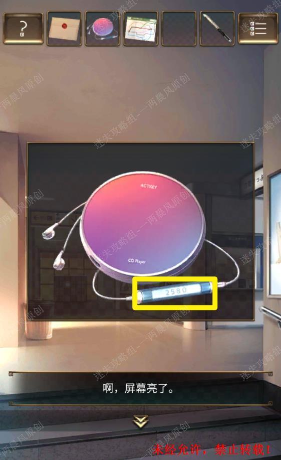 18.点击【CD盘】得到【CD】,将【CD】放在【CD机】中,可以看到亮起的数字“2580”,用【钥匙】打开初始场景中男孩身边行李箱的表盘锁,然后再用得到的数字密码打开行李箱,得到【手机壳】,将【手机壳】交给男孩,本关结束。18 18.1
