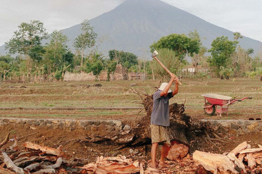 ——当阿贡火山在巴厘岛达塔村旁边喷发时,一名男子正在砍柴。喷发始于2017年12月,持续了一周。141,072人被疏散到安全地点
