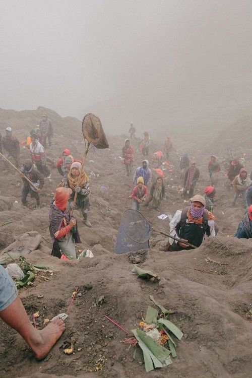 ——在一年一度的卡萨达(Kasada)仪式期间,人们试图接住被抛出的祭品。该仪式在布罗莫火山上举行,旨在纪念山神。人们将大米、水果、蔬菜、鲜花和牲畜扔进火山口以供奉