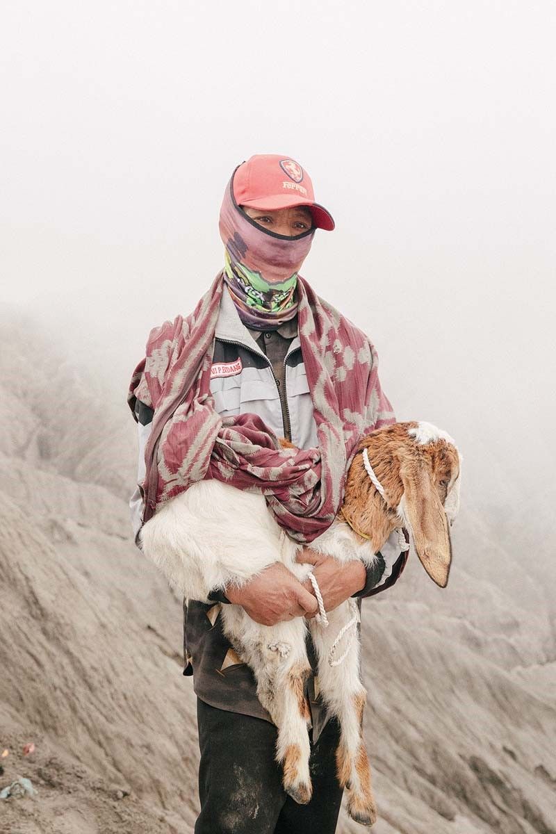 ——在东爪哇布罗莫火山举行的卡萨达仪式上,一名男子手持一只献祭山羊)