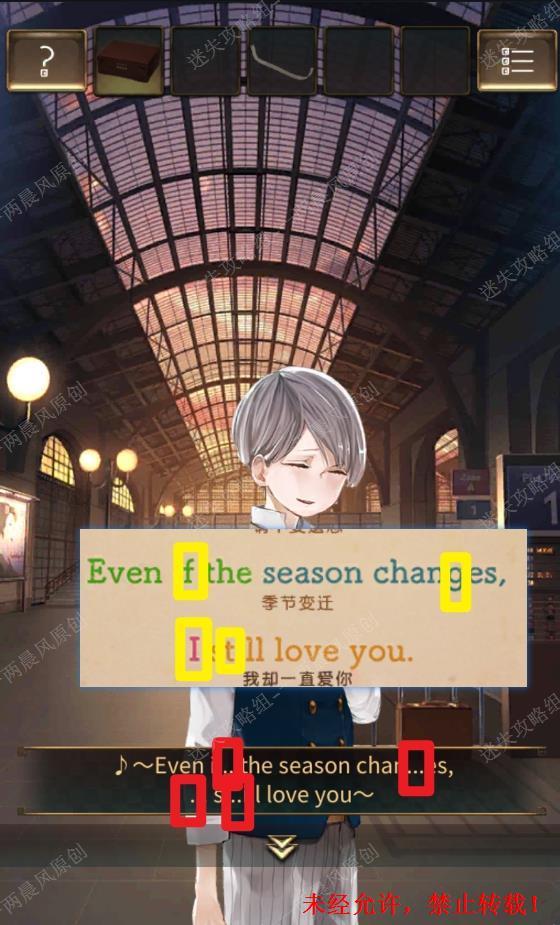 50.点击八音盒上方,可以看到八音盒曲子的歌词,注意曲词的颜色,观察八音盒正面的音符颜色及其上覆盖的叉号含义,回到初始场景,点击男孩,听男孩唱歌,观察男孩唱歌时缺少的歌词,将其与八音盒上的完整歌词对照,可以得到八音盒的密码是“绿F,蓝G,红I,黄T”,将其输入八音盒,即可得到【明信片】。50
