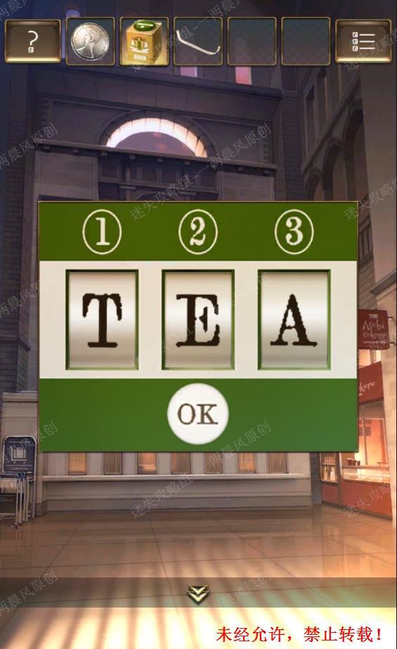 48.点击场景上方大窗户左右侧的海报,在海报上得到数字线索,结合缎带上的英文内容,可以解开茶盒上的密码是字母“TEA”,打开茶盒后用【茶勺】在【茶盒】中找到【零件】48 48.1