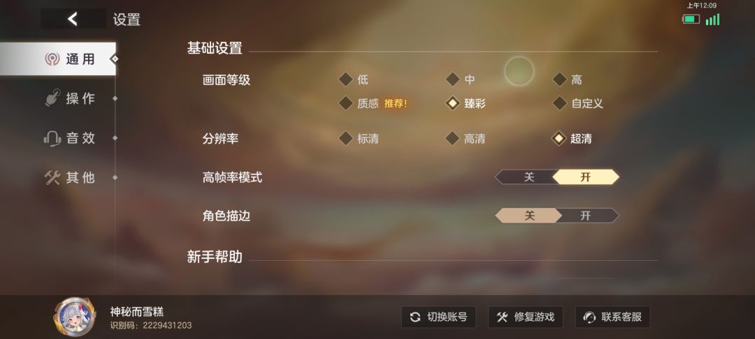 通用设置 画质根据自己的手机或平板的性能来调节吧。最好是选择臻彩。一定一定一定要开高帧,要不然打起来一卡一卡的.