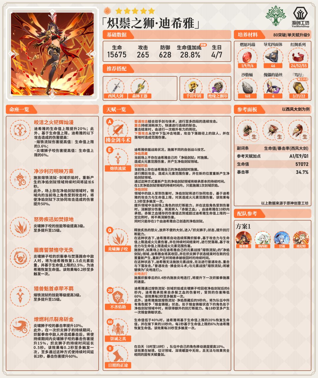 评价:迪希雅的强度并不令人满意,后台2.5s/次的挂火能力对于大多数主C角色来说都是反向打工,持续时间仅9s的霸体也让魈、赛诺这俩长时间战场输出的角色与迪希雅无缘。由于生存方向仅有减伤的效果,因此在大多数情况下仍然无法舍弃掉队伍的治疗角色。