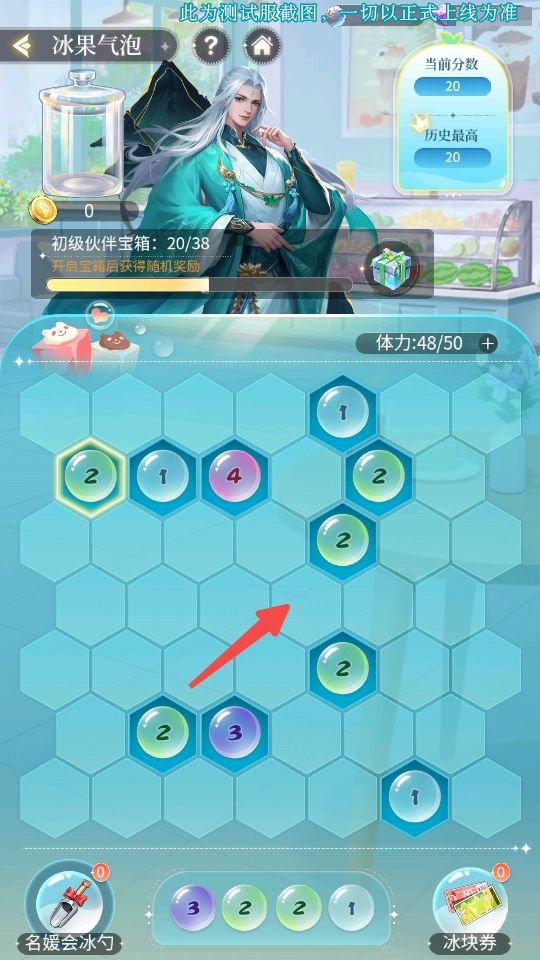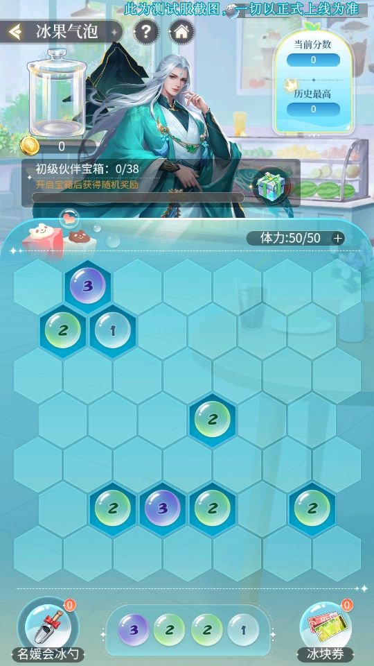 每局开始前需选择一个伙伴,合成冰块获得积分,可增加伙伴宝箱进度,领取宝箱可获得额外道具以及增加伙伴资质经验。