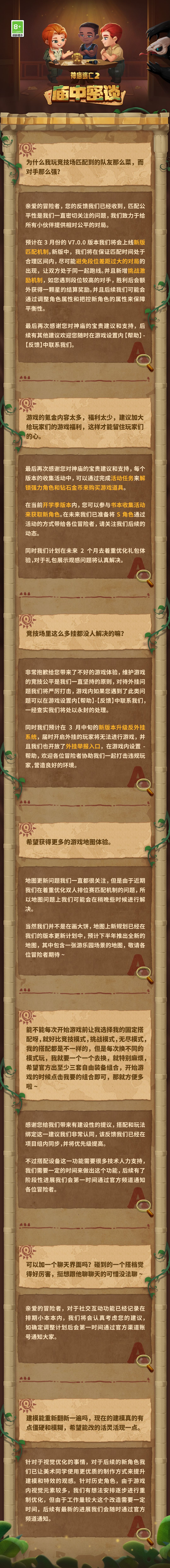 《神庙逃亡2》上线以来,我们在各个平台收到了大量的反馈,庙君在这里精选了近期玩家关注度较高的问题,邀请策划大大们进行了回复。冒险者如果看完还有什么疑惑,都可以在评论区回复,部分问题可能会收录至下一期栏目中!