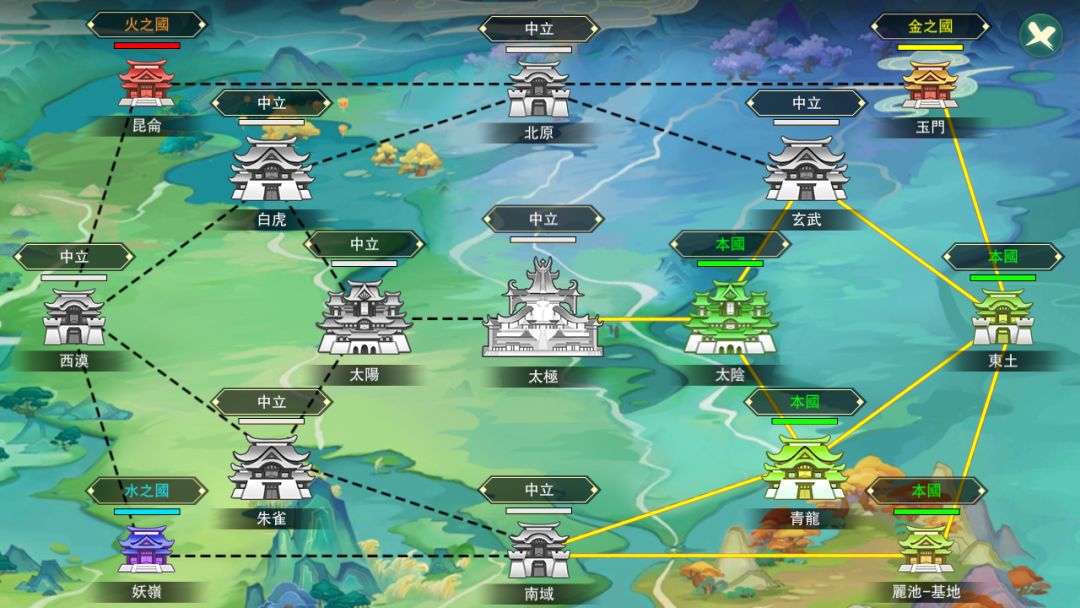 版图玩法是国家中核心的PVE玩法,各服务器从基地出发,挑战相邻的区域副本以获取积分,并通过阵营积分争夺该区域的所属权;或者挑战其他国家已占领的区域副本,来抢夺地盘;