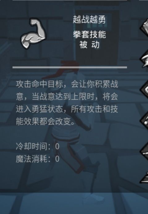 越战越勇被动 可以用别的技能被动覆盖,覆盖后无法叠加战意被动,不用害怕越战越勇会消失,只有切换武器换会拳套 越战越勇就会回来