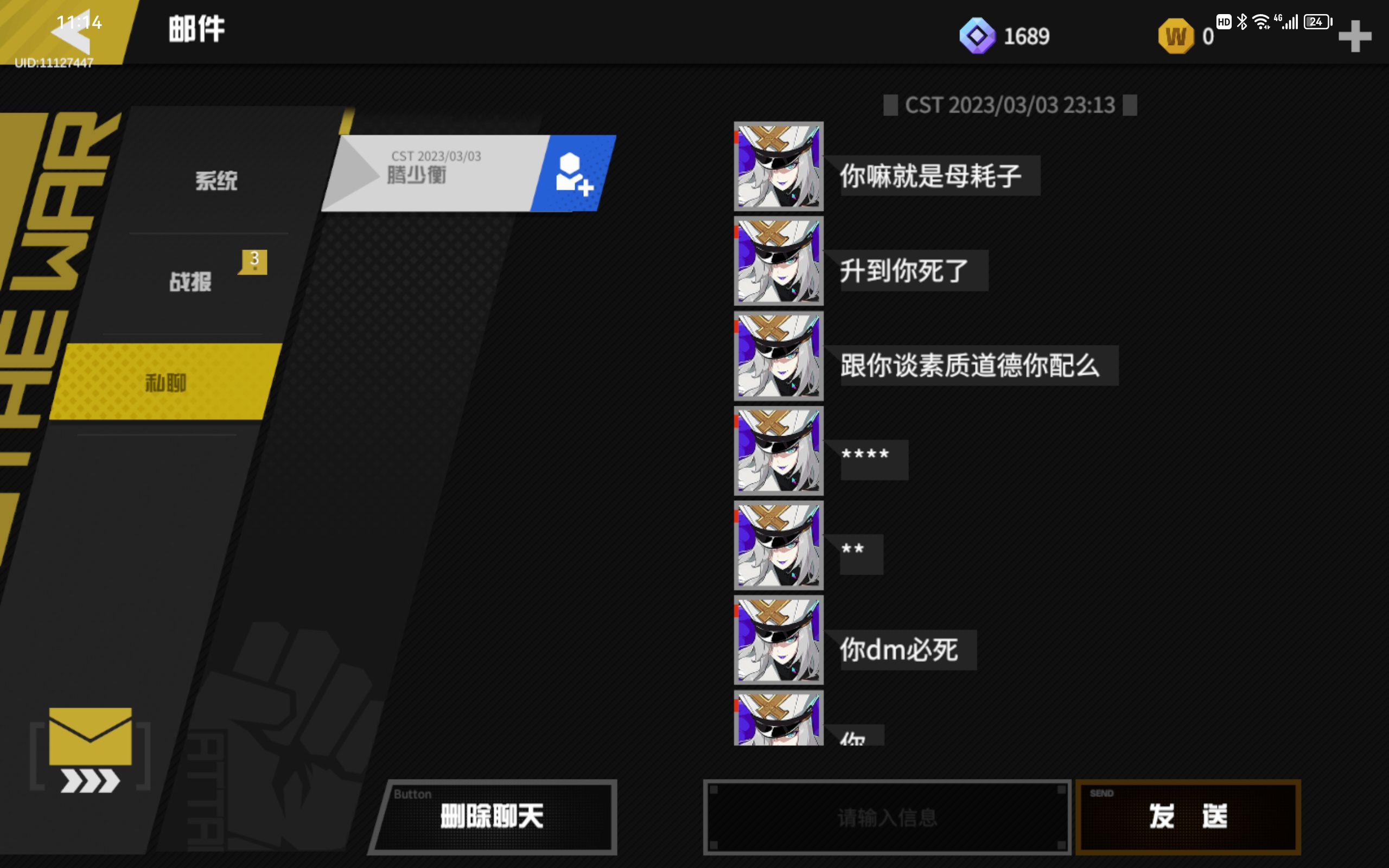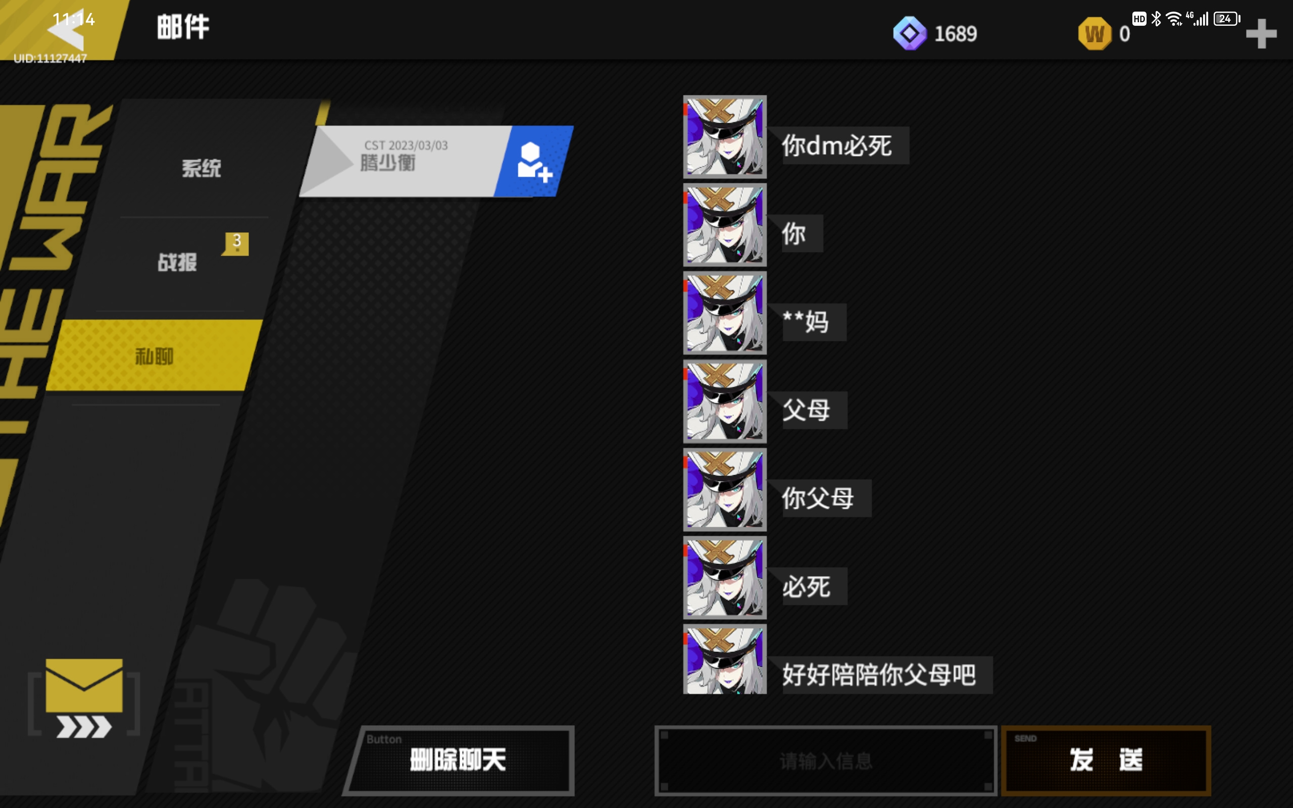 玩个游戏,玩不过就乱骂娘,还一大堆垃圾私信,这素质,哎!希望官方管管
