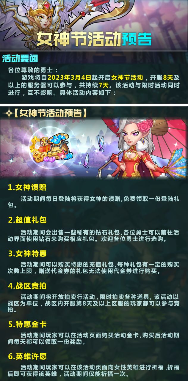 【女神节活动预告】游戏将自2023年3月4日起开启女神节活动,开服8天及以上的服务器可以参与,共持续7天。该活动与限时活动同时进行,互不影响。具体活动内容如下: