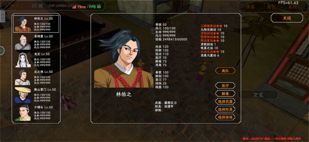 就差一个北之侠了,全员双手互搏,阴邪神剑,求败剑法,九阳,降龙,除了偶尔精英怪一路平推了。主要说说刷双手互搏,这个跟初始属性没关系,我主角刀剑拳暗器全满,也能学互搏,这个跟资质有关,开局进去选了武功看看熟练度就知道能不能学了,随便选一个武功看看比不能学双手的人物需要的熟练度多,基本就能学双手。比如图3前任魔主跟图4少镖头同样学习十八泥偶,少镖头需要2500的熟练度,魔主只要1000,明显少镖头资质更低,所以双手能学