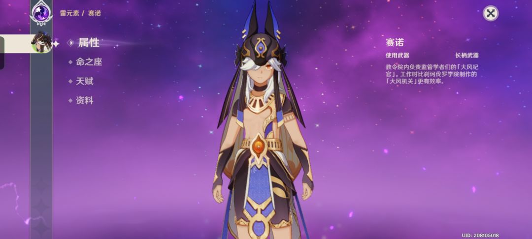 赛诺自身定义为雷系主c,输出手段主要靠大招,且自身特点为超长轴大招角色,需要搭配同样大招,存在时间长的后台辅助角色,如纳西妲,行秋等等
