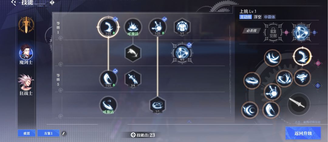 浮空追击流的关键就在于打出浮空控制和高频攻击,通俗来讲便是浮空后一秒数次攻击连到死(略带夸张),那么魔剑士的主动技能学习关键便在于浮空技和速攻技。