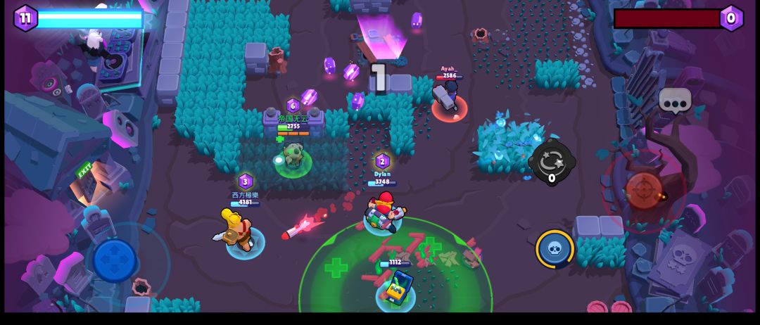 在多人模式中,雪莉尽量不用正面硬刚,多选择边路。就像宝石模式中有很多侧边草丛的图,或者是边路有发挥空间的地图(例如跳板)