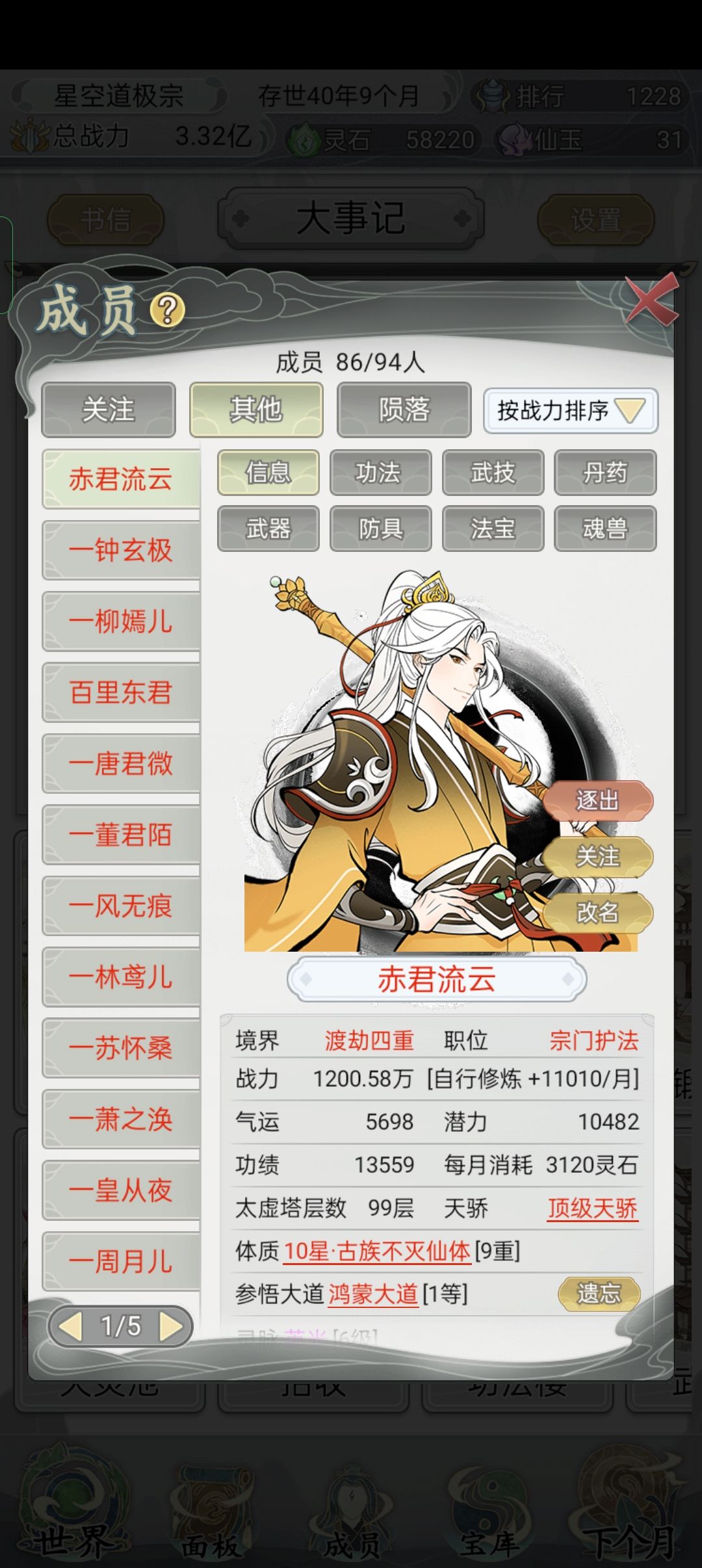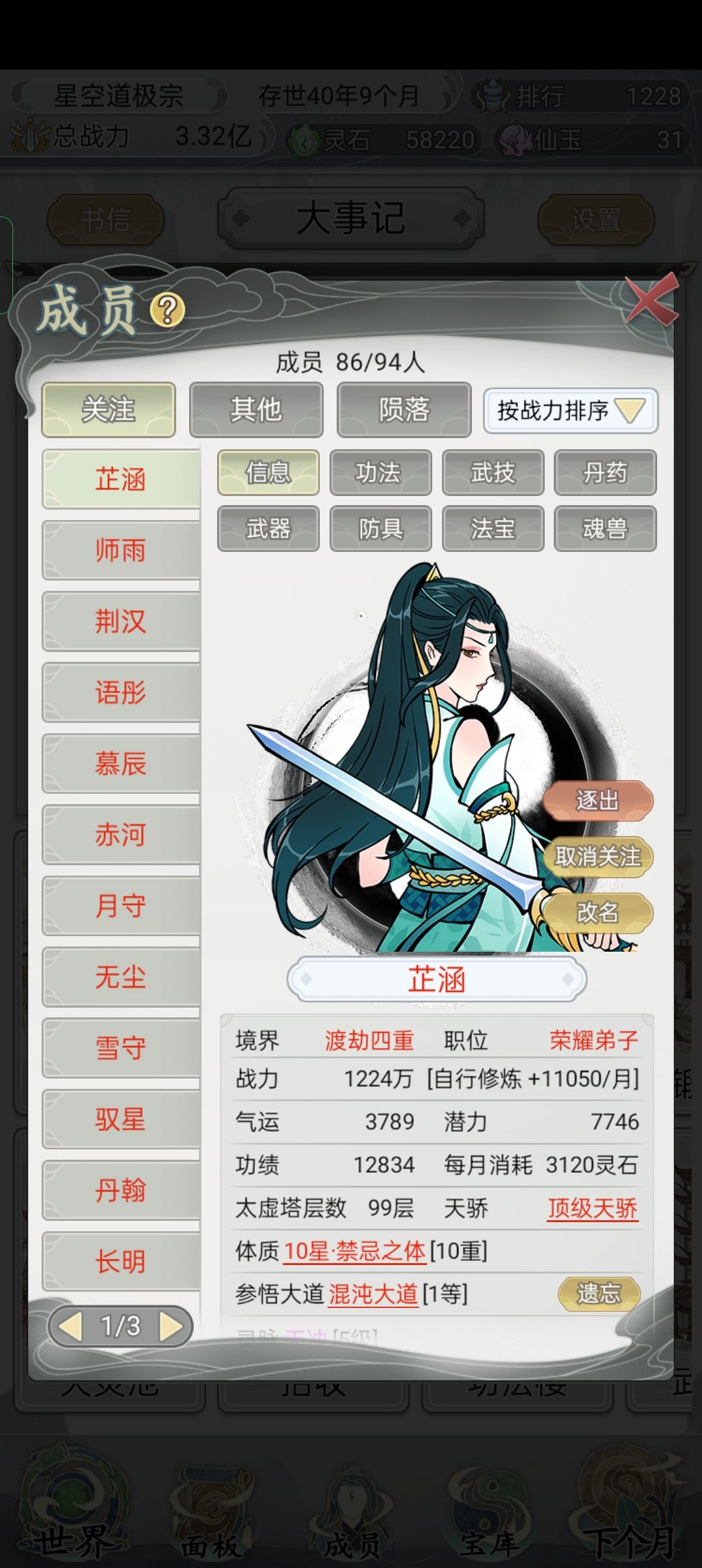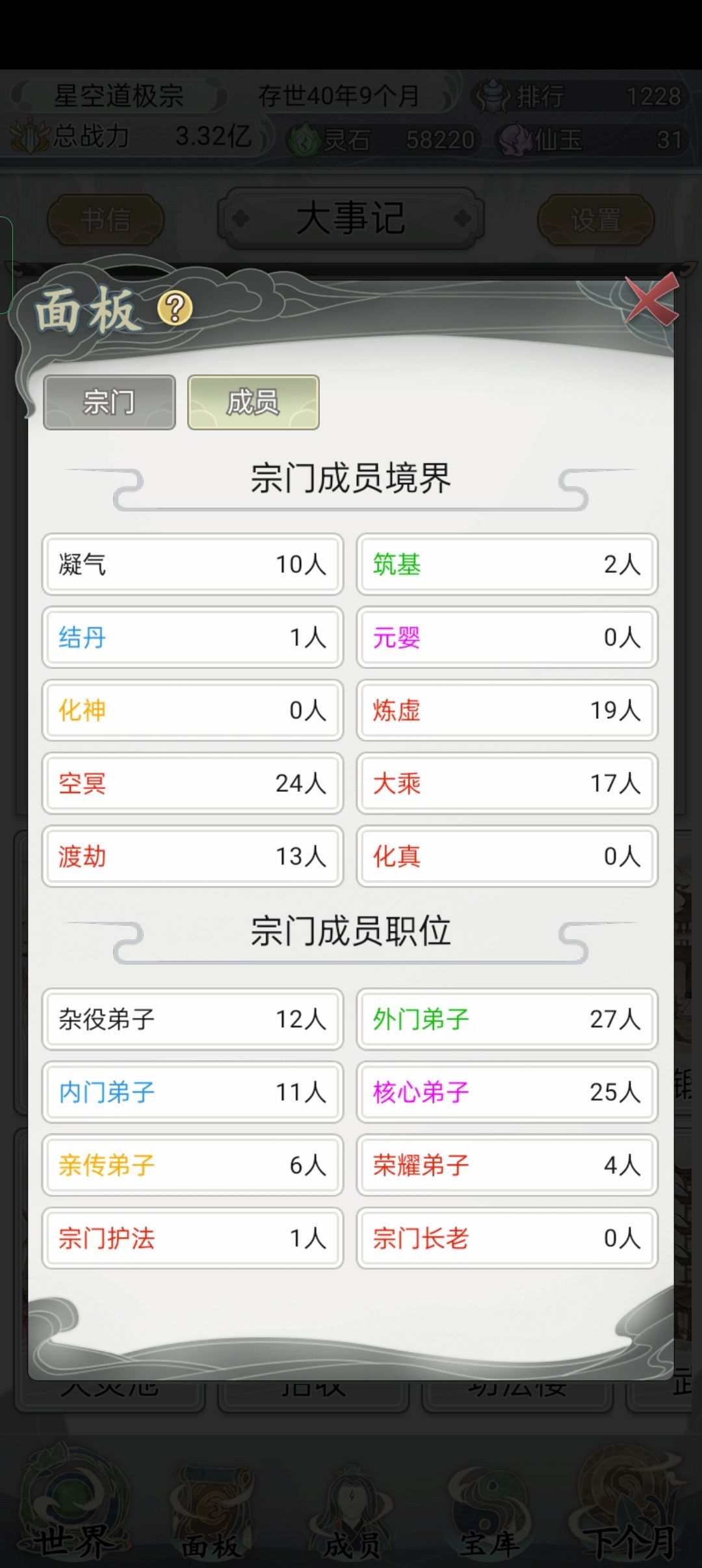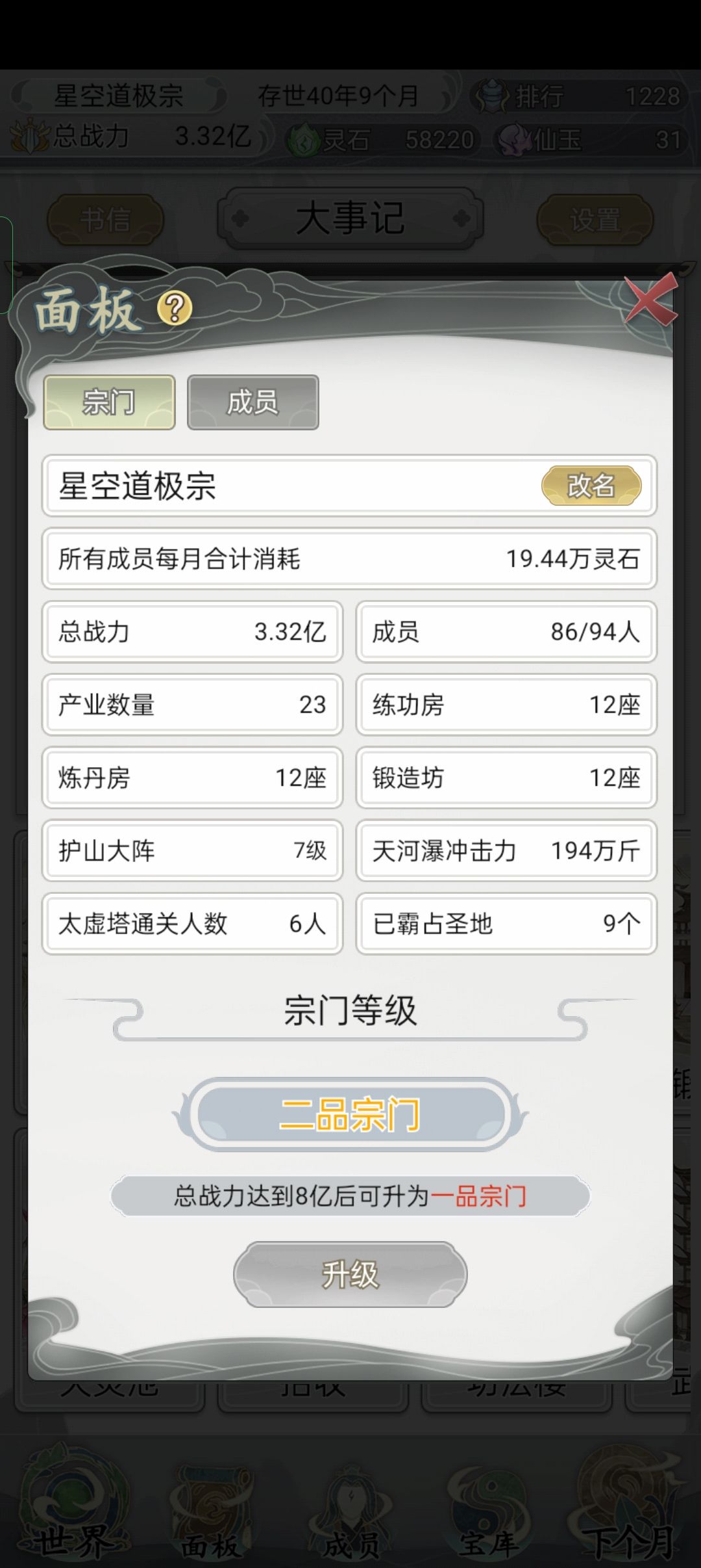不要把其用在"产业""练功房""丹房""锻造房"的升级上(刚起步时可以稍微用一些),在"自动升级"上打个勾,每月可以免费升3级。