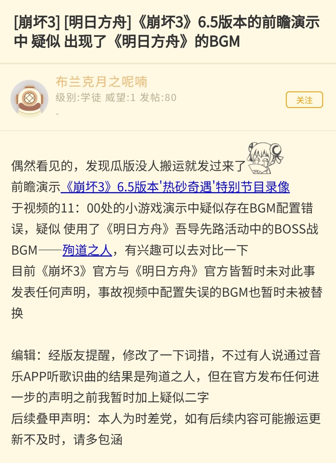 有网友扒出,《崩坏3》6.5版本'热砂奇遇'特别节目录像于视频的11:00处的小游戏演示中疑似存在BGM配置错误,疑似 使用了《明日方舟》吾导先路活动中的BOSS战BGM——殉道之人。