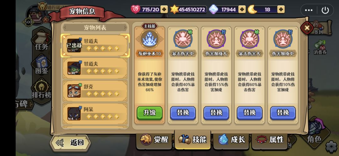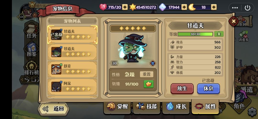 9,宠物,宠物选择甘道夫,想追求极致属性的用甘道夫加铁头合成来突破攻击和敏捷属性。